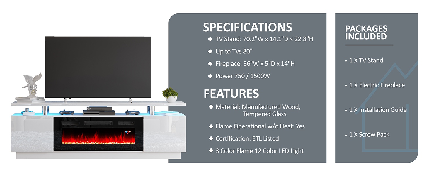 DetailBrand:AMERLIFEPower Source:Corded ElectricProduct Dimensions:14.4"D x 70.2"W x 22.6"HMaterial:Engineered WoodFinish Type:High Gloss & Matte whiteInstallation Type:FreestandingHeat Output:5100 British Thermal UnitsSpecial Feature:70" Modern High Gloss. Adjustable Flame&LED. Temperature Control & Time Setting. 36" Electric Fireplace. 2 Tier DesignStyle:ModernColor:White & Black