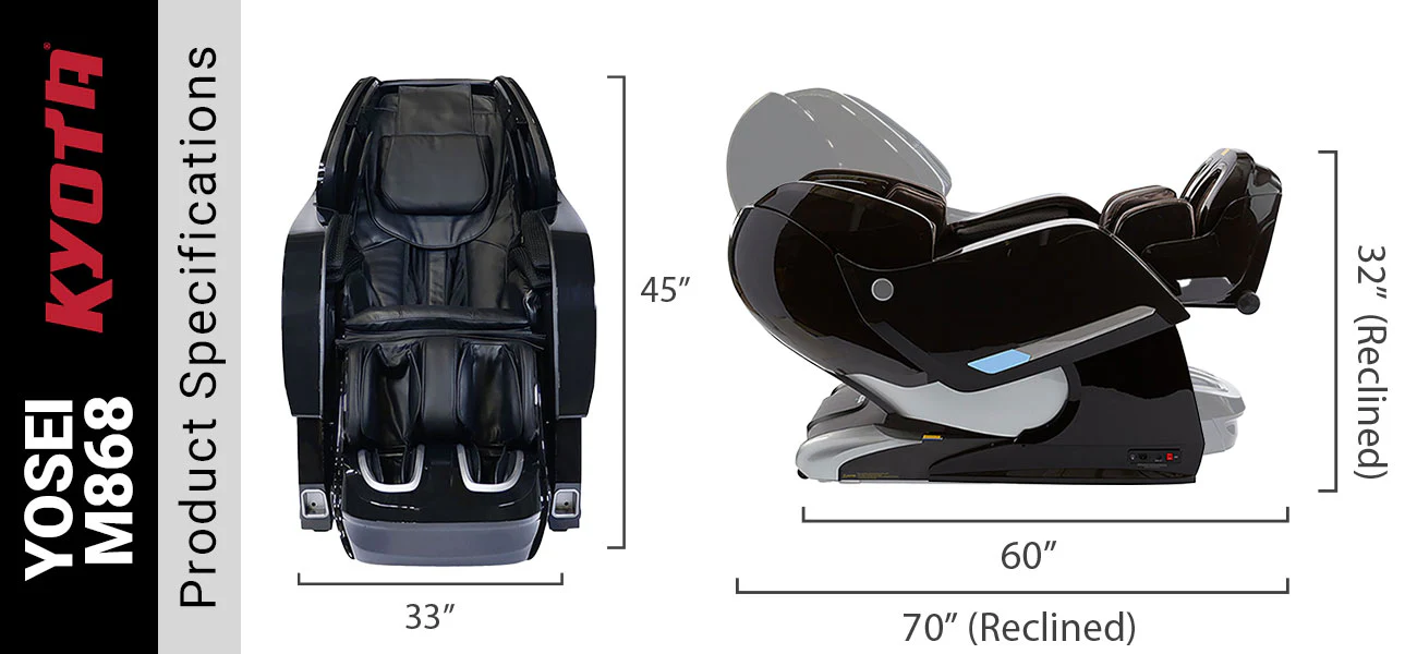 The Kyota Yosei M868 4D massage chair looks as good as it feels. From it's superior quality. to the easy-to-use remote. you get a customizable massage chair tailored to you. Perfect for winding down from a long day at work. relief for chronic pain or preparing for an intense workout. The 4D back massage works down the length of your spine from your neck to glutes. while the triple roller. Total Sole Reflexology. foot massage choreographs a full-body massage experience. Rejuvenate and recover your body in the comfort of home.