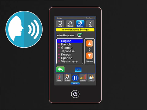 • 7 HUMAN-VOICE RESPONSE System (English. Vietnamese. Spanish. German. French. Japanese. and Korean). This chair gives instructions and confirms the commands you give it!