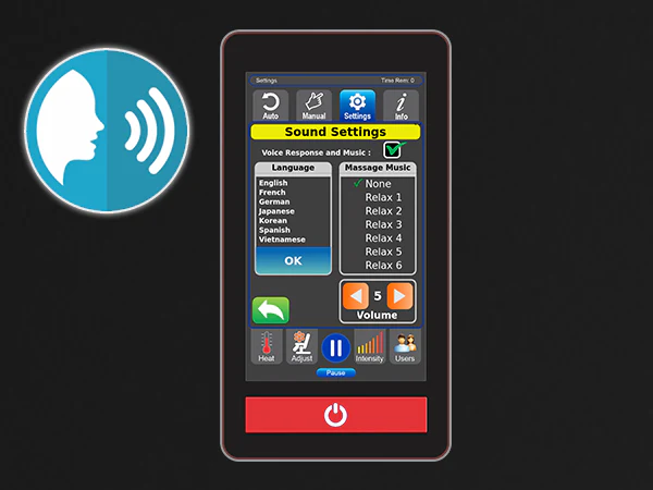 7 HUMAN-VOICE RESPONSE System (English. Vietnamese. Spanish. German. French. Japanese. and Korean). This chair gives instructions and confirms the commands you give it!