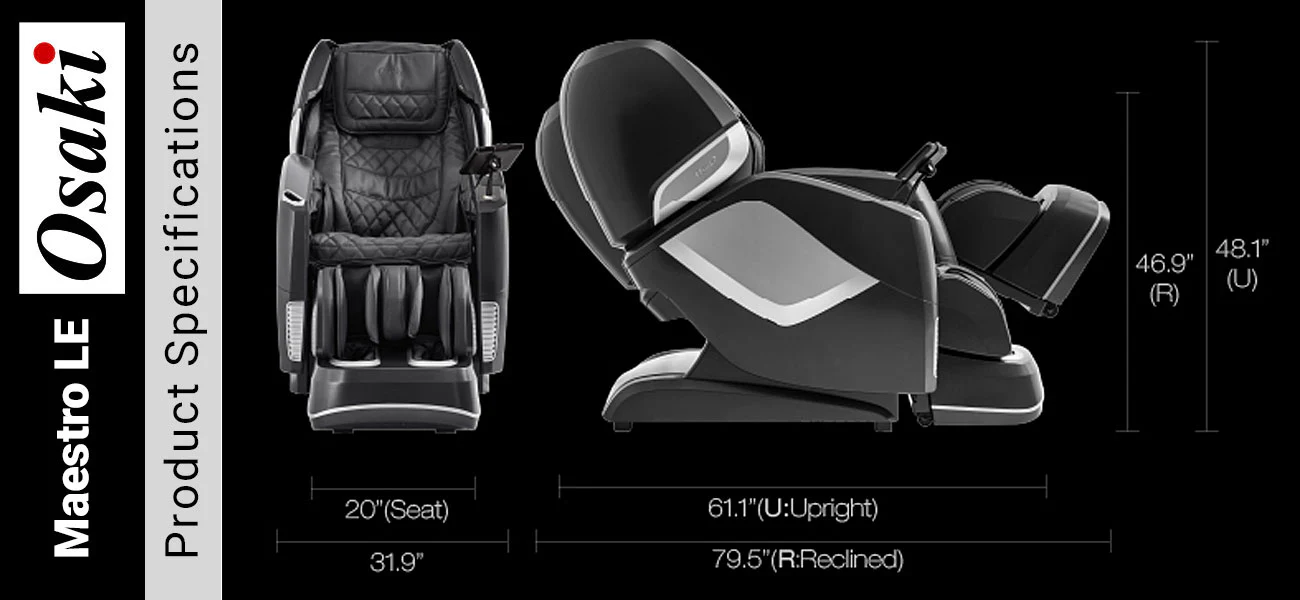 With the Osaki OS-4D Pro Maestro LE massage chair. you will have complete control of your relaxation experience. Massages are adjustable with eight 4D adjustments. plus five instrength. intensity. and speed for the massage rollers.