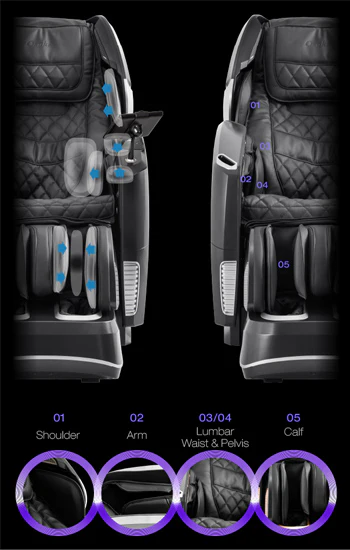 There are multiple airbags located throughout the massage chair to offer a full body massage experience. The Maestro offers a total of 32 airbags in the massage chair. Airbags are located at the shoulders. arms. waist and pelvis. and the calf areas. This compression massage helps to continue increasing blood circulation throughout the body to relieve pain and tension.