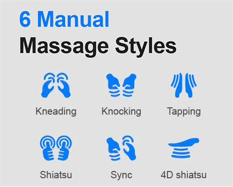 Find your favorite massage style by manually selecting between Kneading. Knocking. Tapping. Shiatsu. Sync. or 4D Shiatsu. Additionally you may manually control your massage's region. width. speed. and roller intensity.