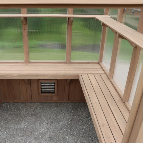 Double-wall polycarbonate windows are strong. durable and provide better insulation over single-wall polycarbonate and deliver superior UV properties and resistance from fading. 6' High Sidewalls provide room height. increasing light and air volume for healthy plant growth. The extra height allows customers to double up shelves and maximize the interior space. Tongue and groove style 32” high cedar base walls add a premium aesthetic and allows for storage of gardening tools that are out of sight from the exterior. The walls also provide protection from rock-shooting lawn mowers. Louvered base wall vent that is necessary for optimum air intake and plant health. Heat sensitive. automatic roof vent opener maintains temperature and humidity. Cedar door includes door latch and closer with quick-hold feature to keep door open. 16” wide lower shelf and 8” wide upper shelf surrounding 2 sides of the interior. 100% FSC certified cedar lumber finished in a Mocha brown stain color.